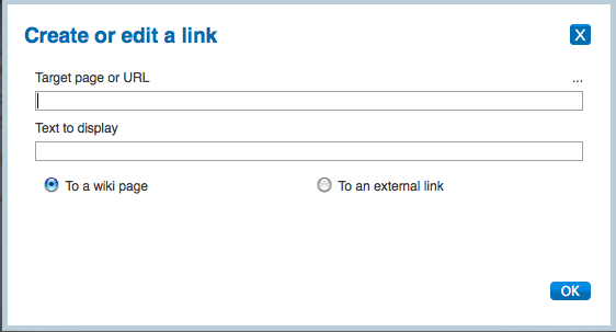 Para ligar a uma página em um espaço nominal, digite o nome do espaço nominal e a página no campo do link, com dois pontos (":") entre eles. Isso deve corresponder com o mesmo texto que é exibido no final da URL da página.