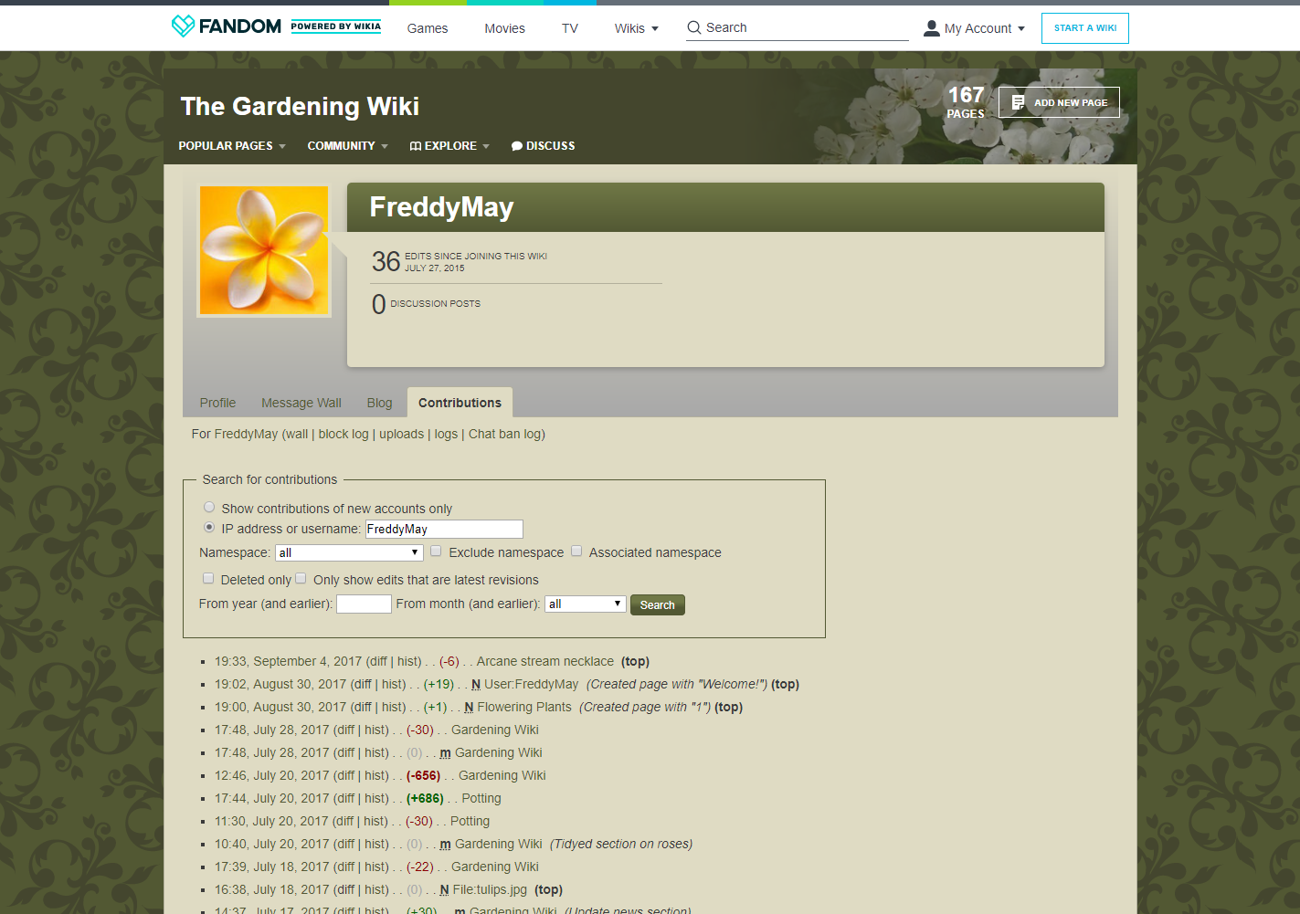 Assim como artigos, cada contribuidor tem o seu próprio "histórico". Essa página lista todas as edições e outras ações que eles fizeram. Para encontrar essa páginas, vá para o perfil dessa pessoa ou mural de mensagens, e clique na aba "contribuições" embaixo do masthead do perfil.