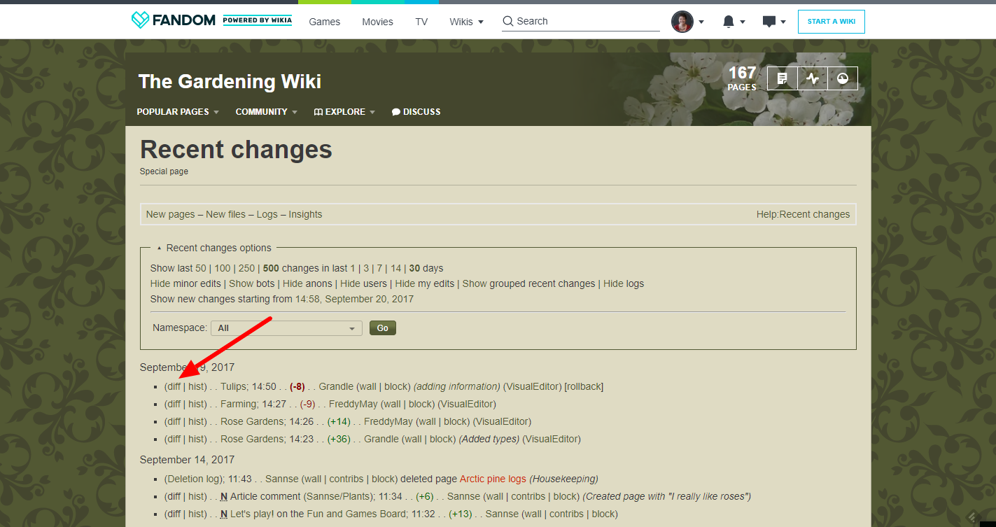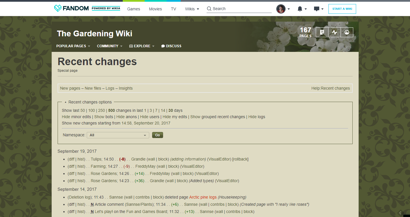 Atividade na Wiki é uma página útil para uma visão geral do que está acontecendo na wikia, mas não fornece todos os detalhes. Os detalhes completos do que está acontecendo na sua comunidade estão nas Mudanças recentes. Essa página essencial lista todas as mudanças na wikia, incluindo edições em páginas que não são mudadas frequentemente, como predefinições.