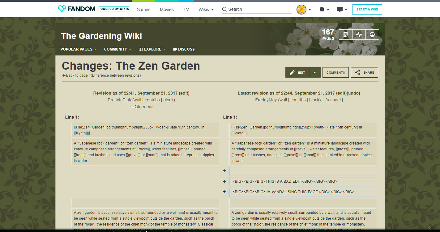 Diffs mostram duas versão de um artigo lado-a-lado. A versão mais antiga está na esquerda, e a mais nova na direita. As mudanças estão destacadas e assim você pode ver facilmente o que é uma boa edição e o que precisa ser revertido.