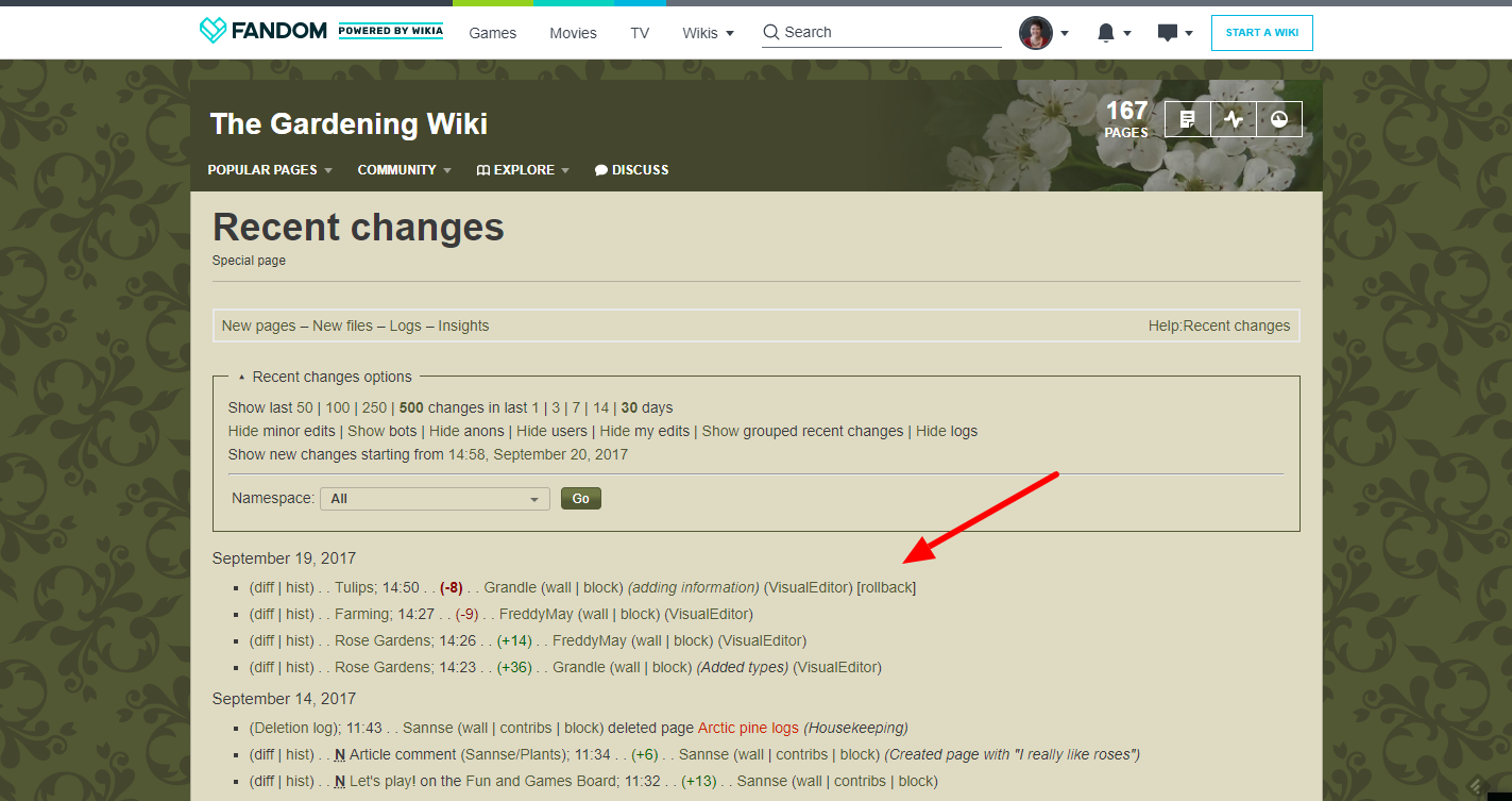 Isso não funciona se a última edição não for a que precisa ser revertida, e também não funciona se houver dois ou mais editores problemáticos no mesmo artigo. Mas em muitos casos, você pode simplesmente solucionar o problema clicando no link rollback à medida que você confere a lista. Essa função é na verdade uma das funções mais importantes nas wikias porque faz com que seja mais fácil consertar vandalismo do que é criar. O que significa que administradores tem uma vantagem em limpar edições problemáticas.