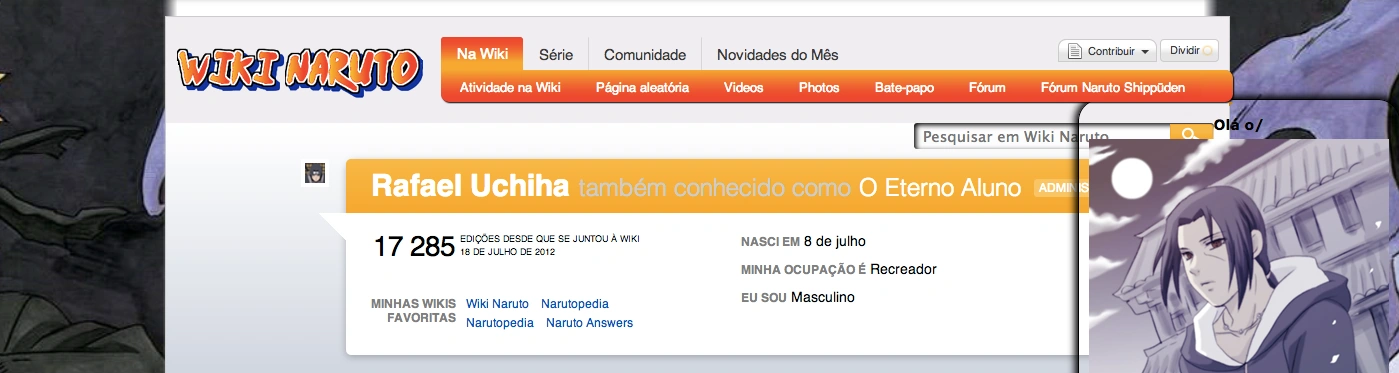 Olá! Hoje venho apresentar mais um Wikiano em destaque! O escolhido de hoje é o Rafael Uchiha, um dos admins da wikia Naruto. Ele foi um indicado por um usuário por que "ele me ajudou muito no meu começo nas wikis, ele me ensinou, com muita calma e sabe editar muito bem". Outro relato de uma usuária: "Ele é um dos atuais administradores, e talvez o mais ativo, da Wiki Naruto. Além de ser muito responsável e paciente com os usuários, Rafael é um ótimo editor e seus artigos são muito bem organizados. O fato da Wiki Naruto ser uma das maiores wikias em português é, em boa parte, resultado dos esforços do usuário Rafael Uchiha". Ele ainda foi nominado por outro usuário '"pelo seu ótimo desempenho com a Wiki Naruto, tendo chegado na mesma em Julho de 2012 o mesmo já havia atingido 5.000 edições em alguns meses tendo hoje em dia 15.000 edições significativas sem falar de sua experiência com Wikis e sua bondade em ajudar os outros e tirar dúvidas o que na minha opinião o torna qualificado o suficiente para ser o Wikiano em Destaque". Bom trabalho, Rafael!