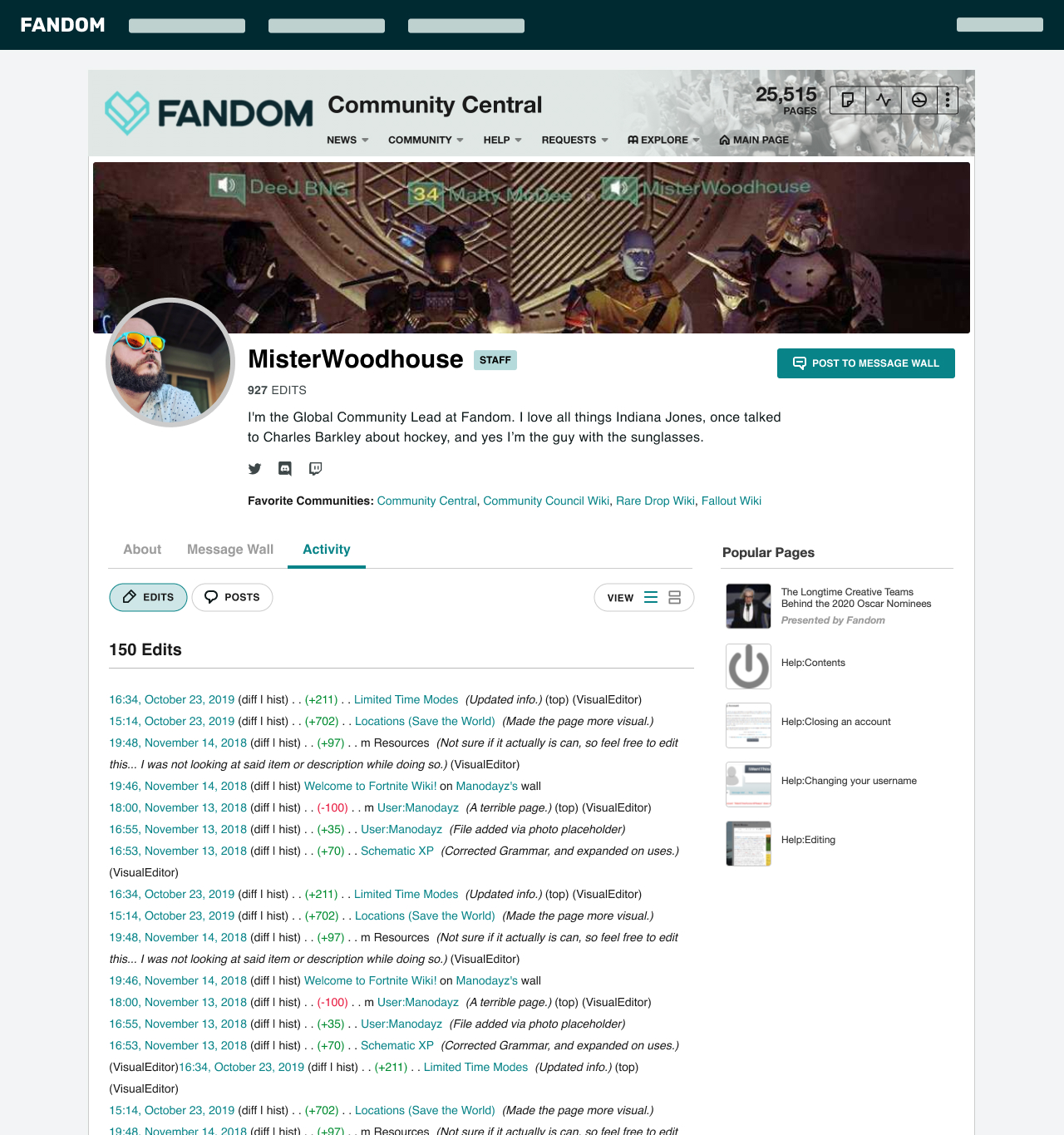 A contribuições foi renomeada para atividade, pois descreve com mais precisão a função desejada daqui para frente: exibindo sua atividade em uma determinada comunidade. Desde que o perfil foi atualizado pela última vez, suas contribuições gerais à plataforma aumentaram para incluir discussões. Queremos que a guia Atividade seja onde você possa encontrar mais informações sobre o envolvimento de um usuário nas edições da wiki e no social, como você pode ver na tela abaixo - com Edições representando contribuições da wiki e Postagens representando contribuições das discussões. Isso também se aplica a futuros tipos de conteúdo, pois o UCP é nossa base para inovação, com o aprimoramento da experiência da comunidade com o conteúdo do wiki no centro.