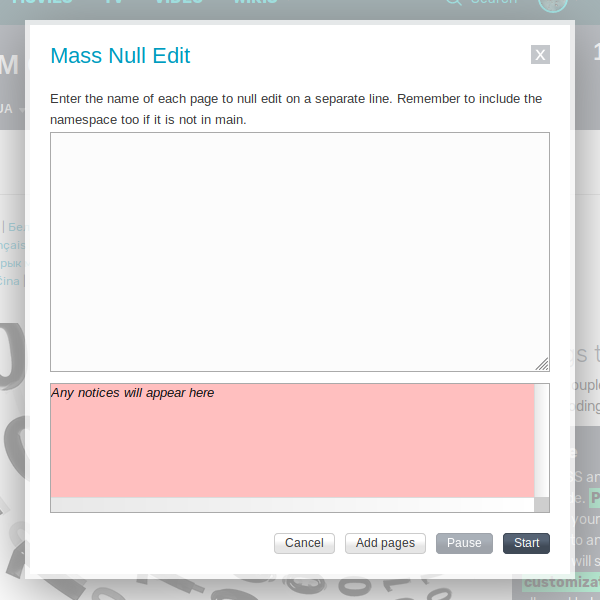 - MassNullEdit - Uma ferramenta para editar páginas nulas em lotes, atualizando o cache e atualizando todos os links desatualizados na página. Pode ser particularmente útil para solucionar problemas de outras personalizações em escala. Criado por Ozank Cx com contribuições de DarthKitty e OneTwoThreeFall.