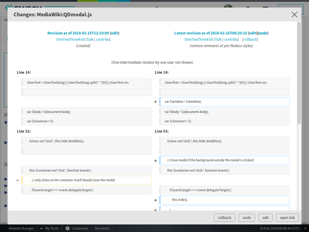 - QuickDiff - Esta personalização permite que você invoque uma tela modal para uma visualização rápida de um diff de edição. Muito útil para patrulhar mudanças recentes. Criado por OneTwoThreeFall.