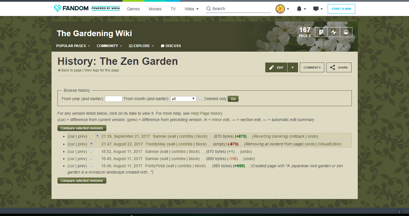 Isso não funciona se a última edição não for a edição ruim e também não funciona se há dois ou mais editor no mesmo artigo. Mas em muitos casos você pode simplesmente rolar a página de contribuições para baixo e clicar no link de rollback. Essa pequena função é na realidade uma das mais importantes em wikis porque isso torna fácil consertar vandalismo de que é para cria-lo, o que significa que os administradores têm uma vantagem em limpar qualquer edição problemática.