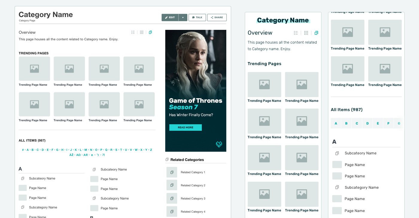 - As categorias são mostradas em uma lista para manter a utilidade da página para administradores e editores, ao mesmo tempo mostrando a navegação visual no topo com páginas de tendências para que você possa ver por onde as pessoas estão navegando.